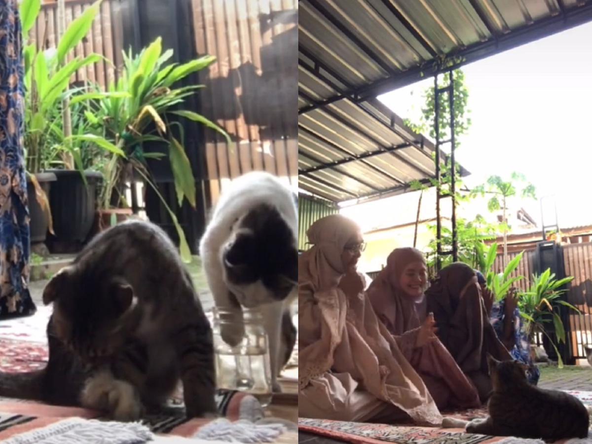 Akun twitkocheng mengunggah sebuah video yang memperlihatkan aksi seekor kucing berwarna oranye sedang berkomunikasi dengan dua orang yang sedang salat. Video tiga anak kucing yang gangguin sang pemilik salat ini bikin gemas. Terlihat majikan kucing itu sedang melaksanakan salat.